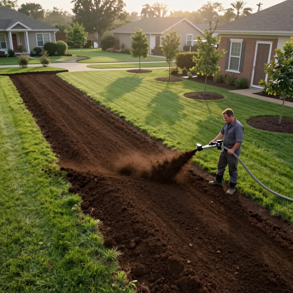 Technologically advanced topsoil application for seeding, lawn repair, and garden bed preparation with minimal site impact.